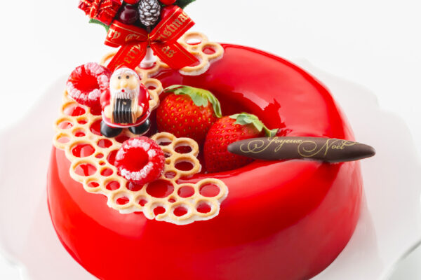 クリスマスのサンタクロースとリースをイメージして仕上げたケーキ。バナナとヨーグルトのブリュレとムースマスカルポーネをムースフランボワーズでとじ込め、赤い艶やかなグラサージュでコーティングしました。※限定40台※ロウソク小5本付き